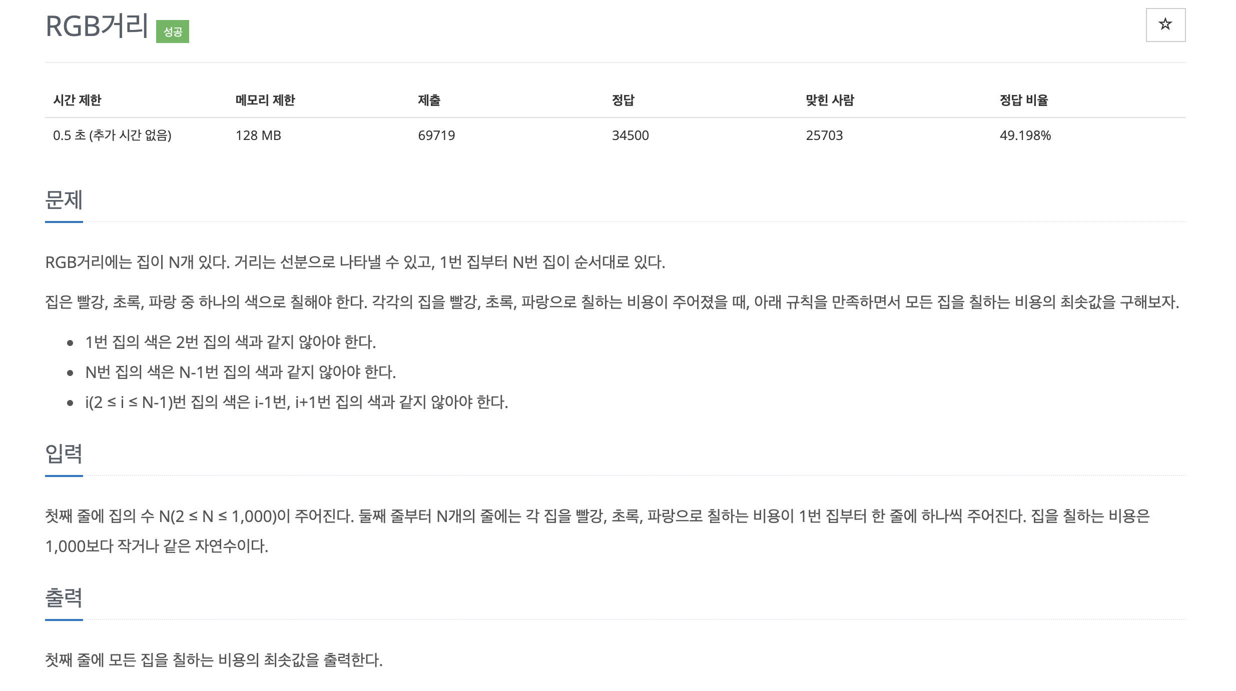첫째 줄에 집의 수 N(2 ≤ N ≤ 1,000)이 주어진다. 둘째 줄부터 N개의 줄에는 각 집을 빨강, 초록, 파랑으로 칠하는 비용이 1번 집부터 한 줄에 하나씩 주어진다. 집을 칠하는 비용은 1,000보다 작거나