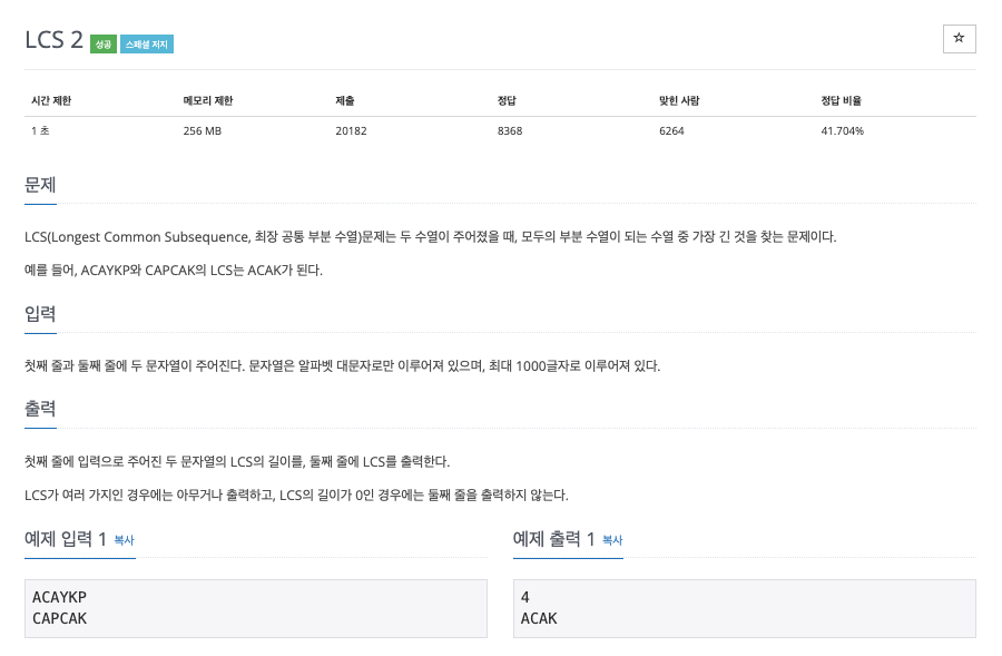 LCS(Longest Common Subsequence, 최장 공통 부분 수열)문제는 두 수열이 주어졌을 때, 모두의 부분 수열이 되는 수열 중 가장 긴 것을 찾는 문제이다. 예를 들어, ACAYKP와 CAPCAK의 LCS는 ACAK가 된다.