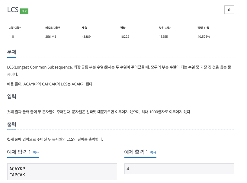 LCS(Longest Common Subsequence, 최장 공통 부분 수열)문제는 두 수열이 주어졌을 때, 모두의 부분 수열이 되는 수열 중 가장 긴 것을 찾는 문제이다. 예를 들어, ACAYKP와 CAPCAK의 LCS는 ACAK가 된다.