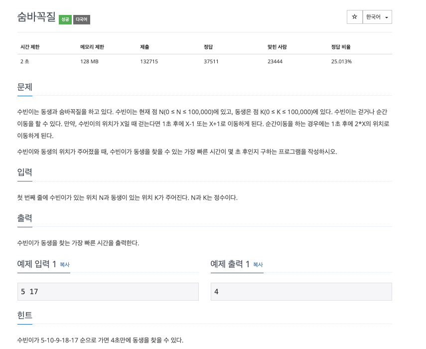수빈이는 동생과 숨바꼭질을 하고 있다. 수빈이는 현재 점 N(0 ≤ N ≤ 100,000)에 있고, 동생은 점 K(0 ≤ K ≤ 100,000)에 있다. 수빈이는 걷거나 순간이동을 할 수 있다. 만약, 수빈이의 위치가 X일