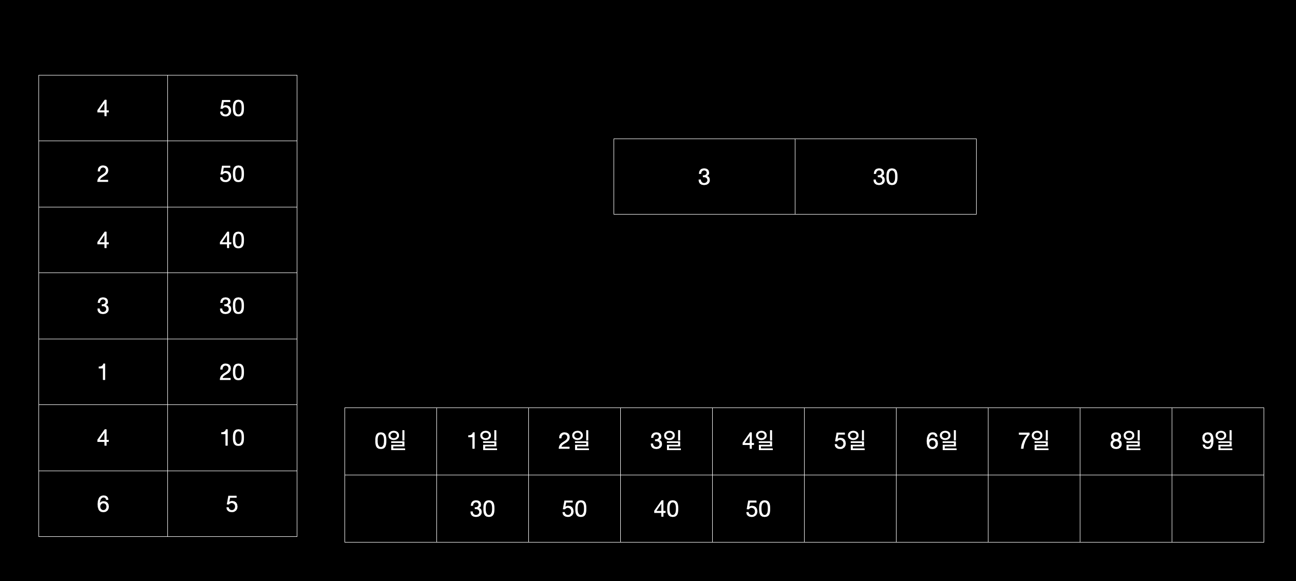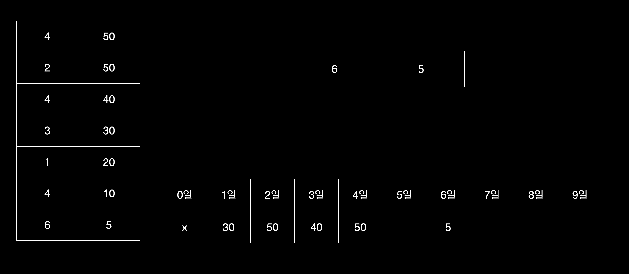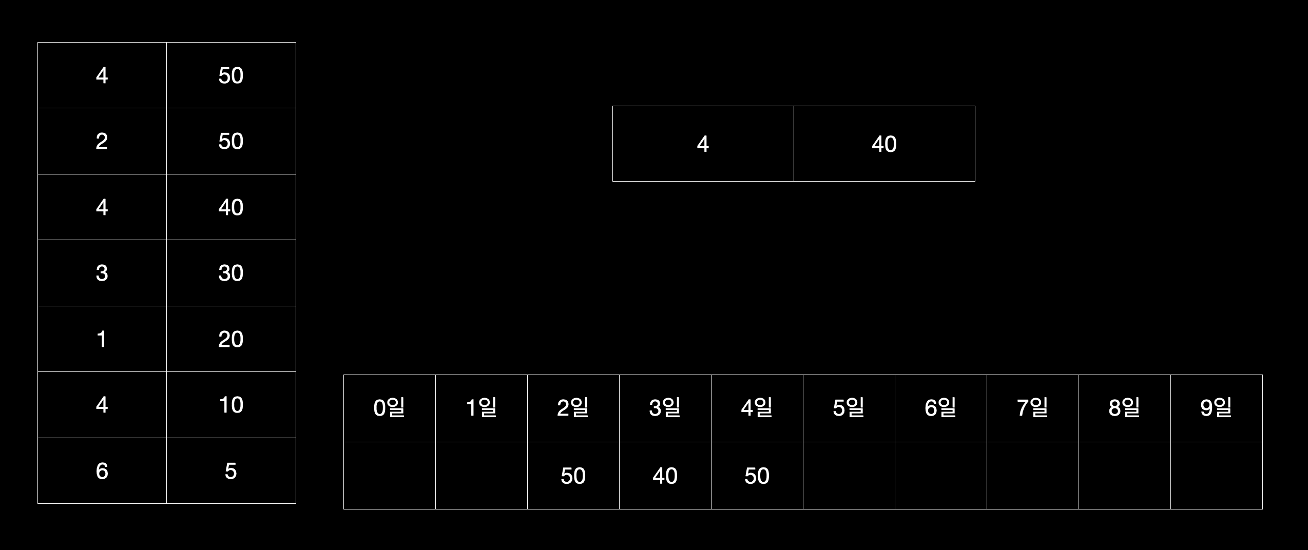 [4, 40] -> 4일 부터 마감일을 하나씩 줄여가며 빈칸에 값을 넣는다 3일째가 비어있으므로 3일에 40 투척
