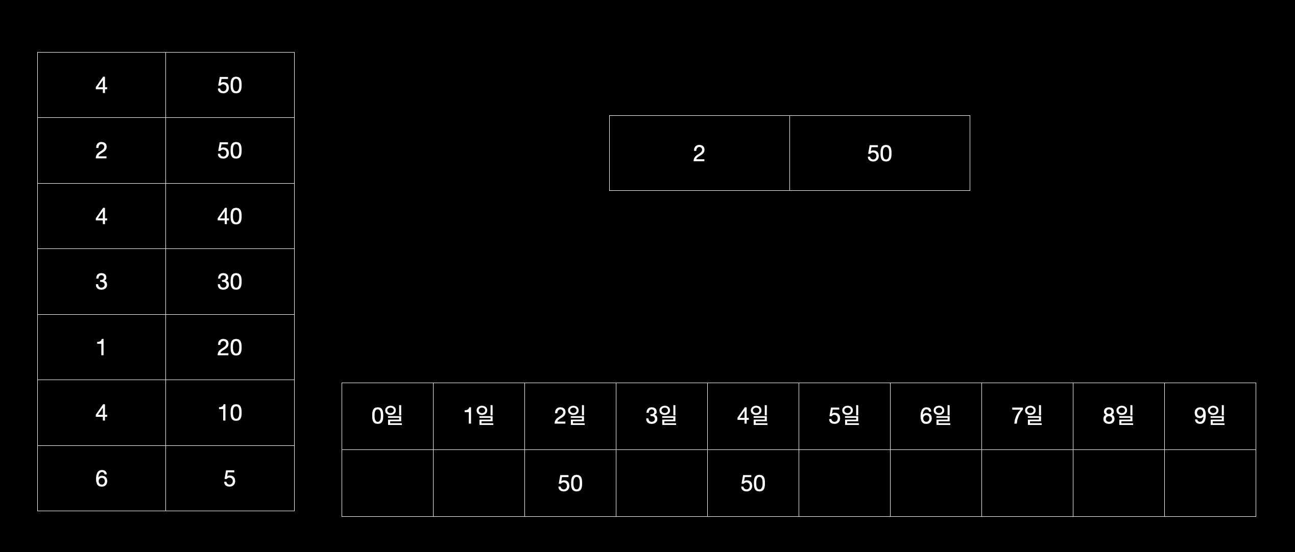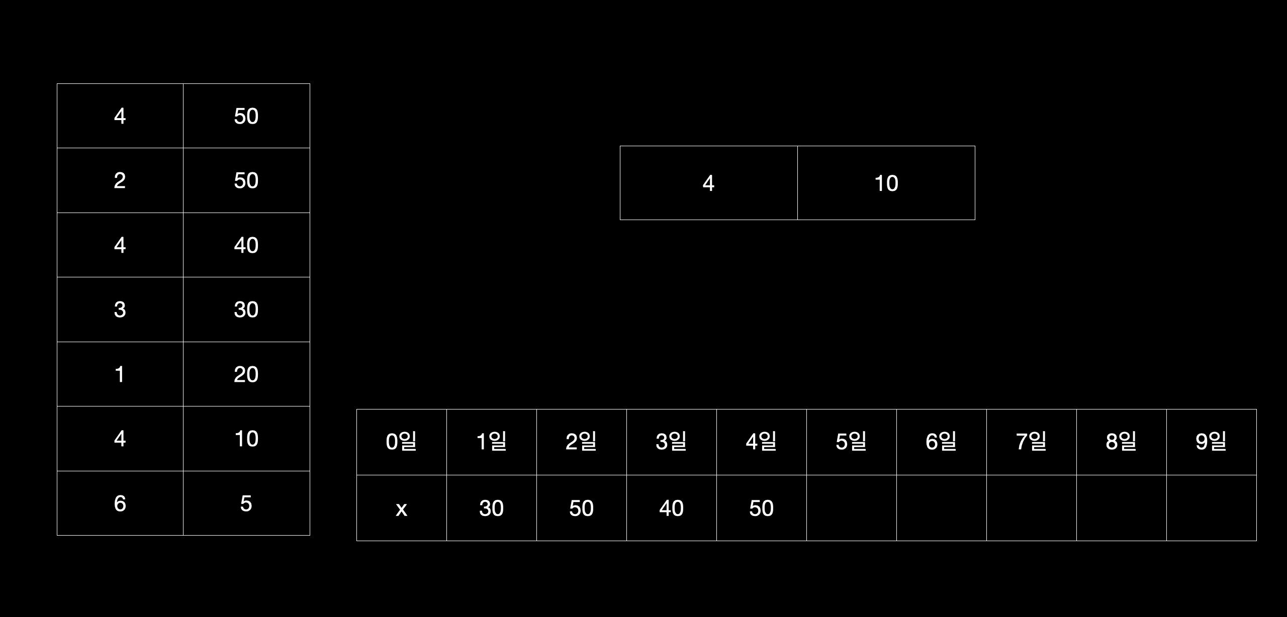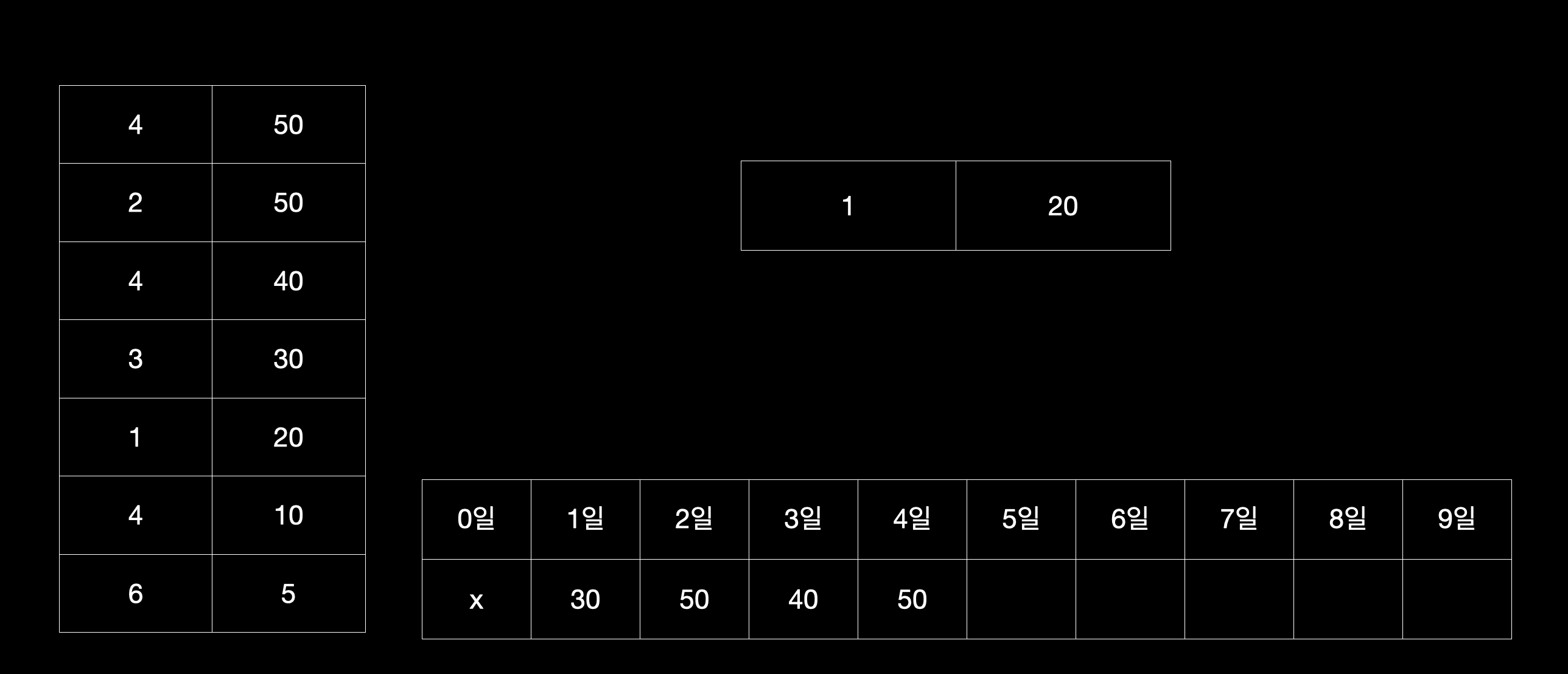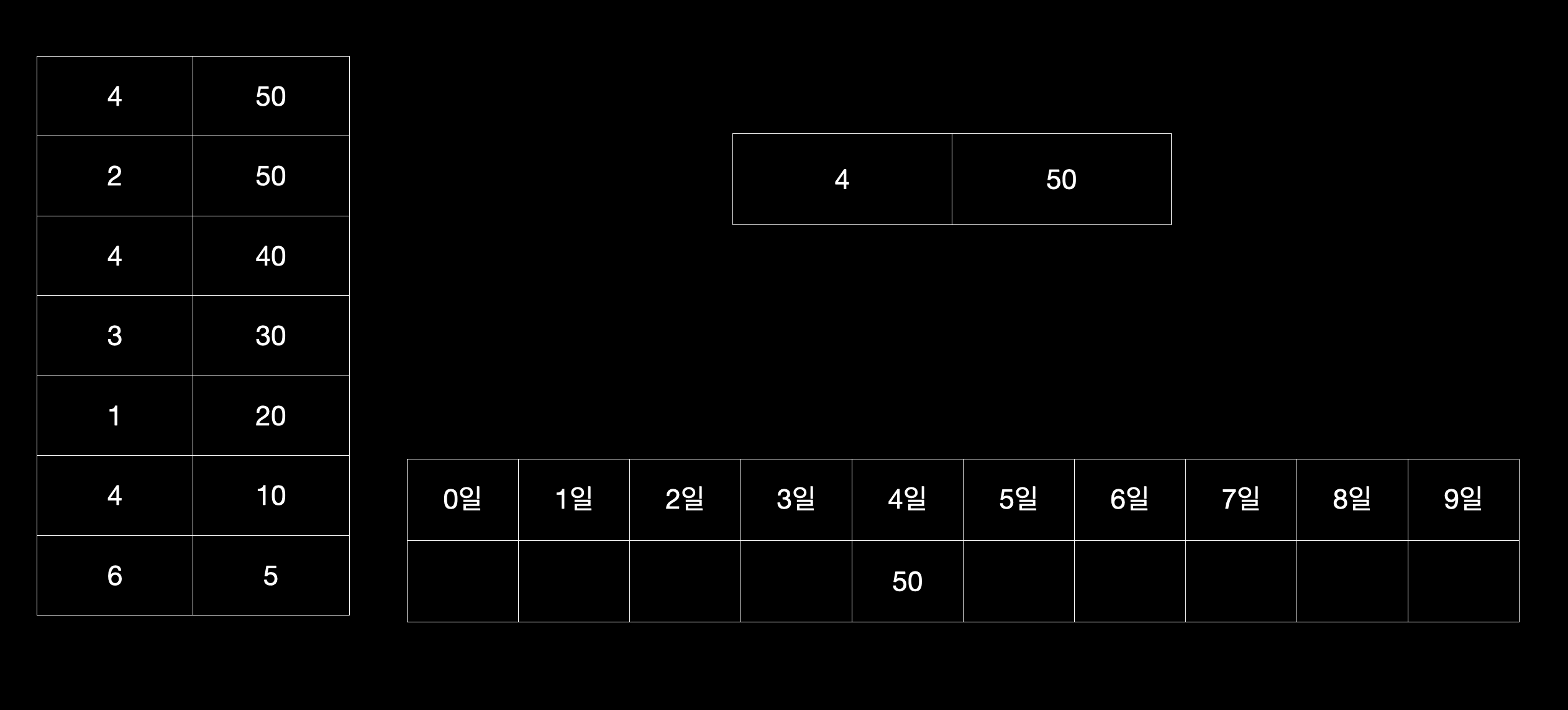 [4,50] -> 4일 부터 마감일을 하나씩 줄여가며 빈칸에 값을 넣는다 4일째가 비어있으므로 4일에 50 투척