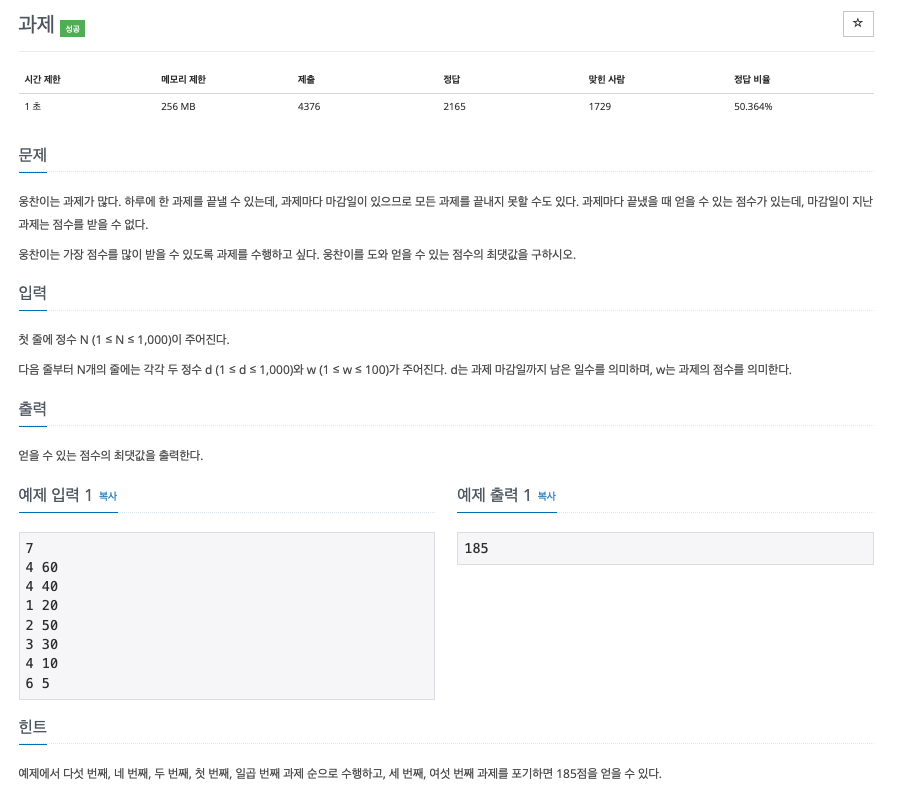 예제에서 다섯 번째, 네 번째, 두 번째, 첫 번째, 일곱 번째 과제 순으로 수행하고, 세 번째, 여섯 번째 과제를 포기하면 185점을 얻을 수 있다.