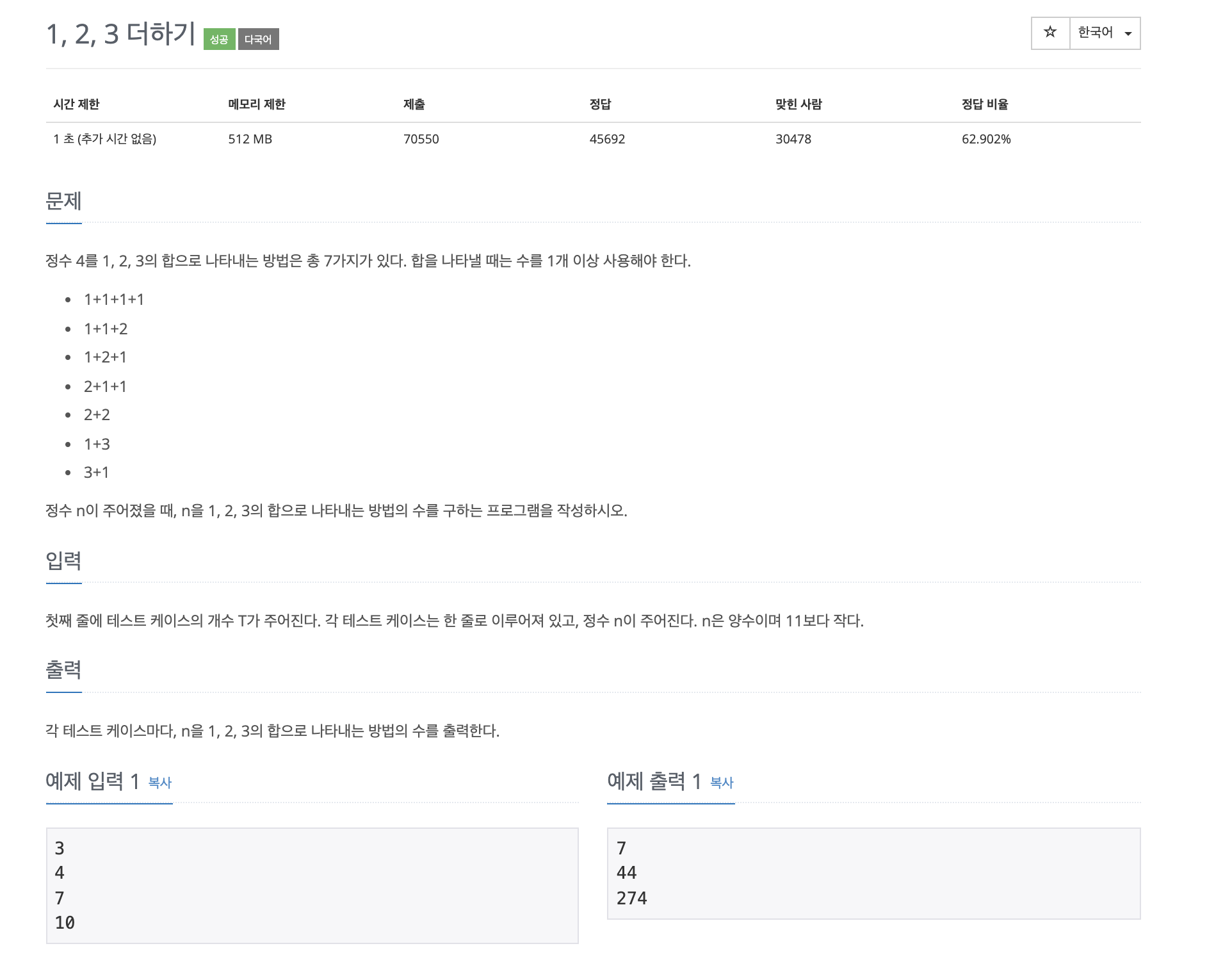 4를 만드는 경우의 수는 1을 만드는 경우의 수 + 2를 만드는 경우의 수 + 3을 만드는 경우의 수 이다.