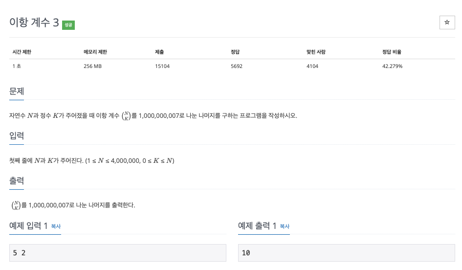 자연수 \(N\)과 정수 \(K\)가 주어졌을 때 이항 계수 \(\binom{N}{K}\)를 1,000,000,007로 나눈 나머지를 구하는 프로그램을 작성하시오.