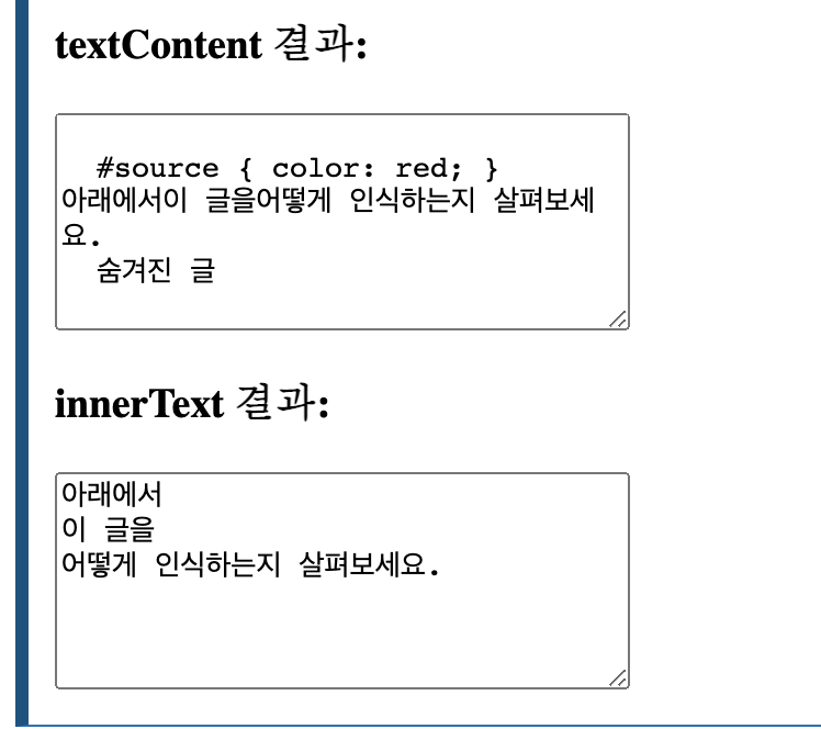 innerText는 텍스트의 렌더링 후 모습을 인식할 수 있지만 textContent는 인식할 수 없습니다.