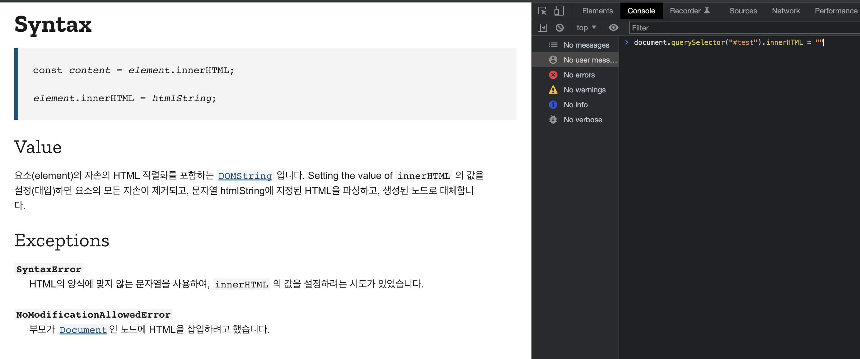 최근 프로젝트를 구현하던 중 DOM 요소의 text를 바꾸는 데도 innerHTML을 쓰는 것으로 피드백을 받은적이 있습니다.