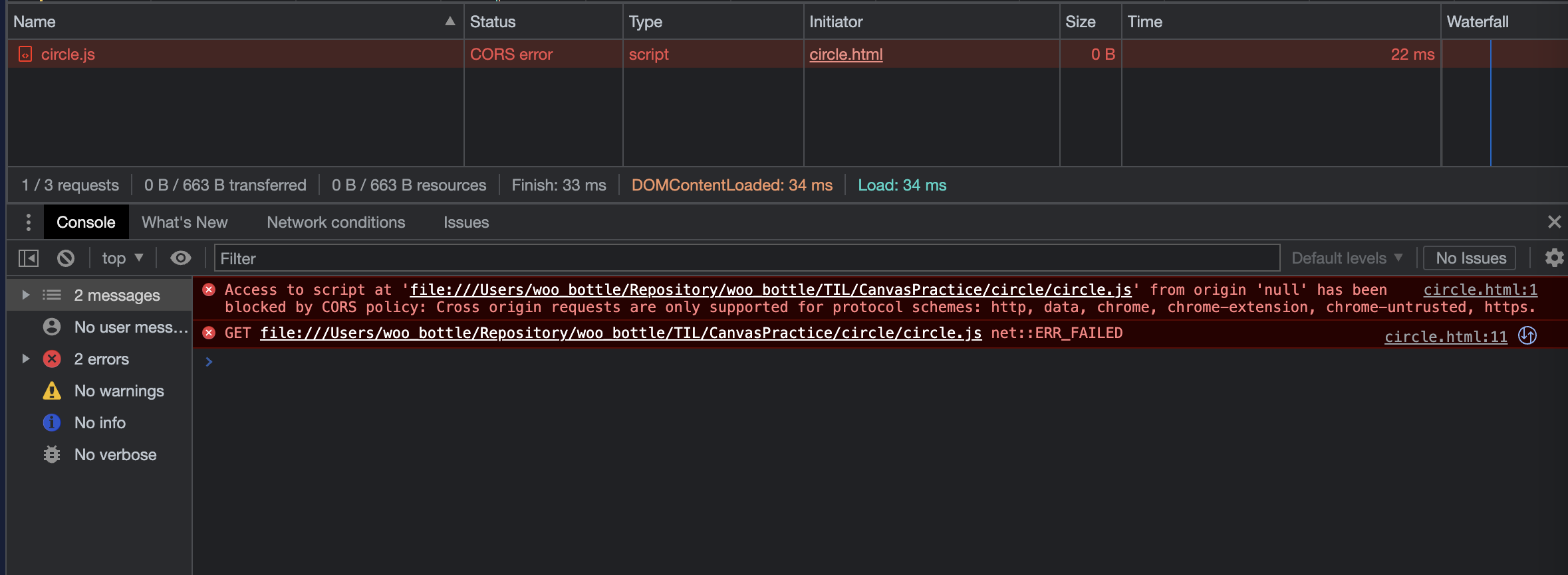 위의 error는 vscode 환경에서 live server로 html 파일을 실행시키거나 http-server 패키지를 이용하면 해결할 수 있습니다.
