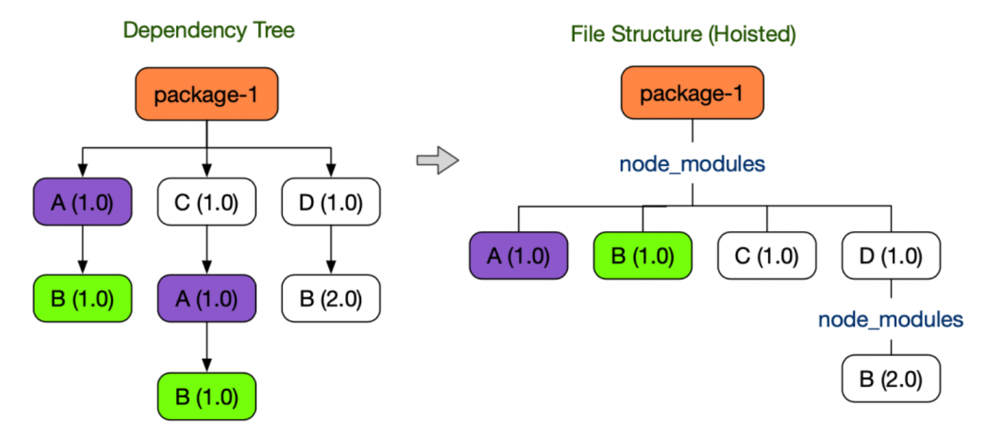 패키지 의존성 트리에서 공통으로 설치되는 패키지들은 hoisting하여 tree를 flatten하게 만들어 줍니다.