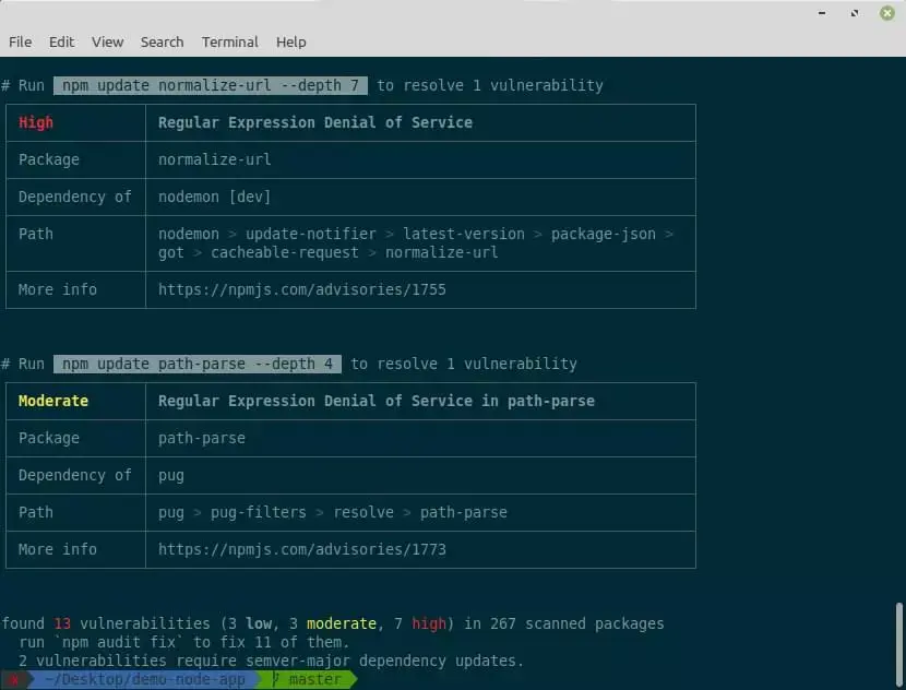 npm은 설치 중간에 패키지들의 보안 취약성을 검사하고 취약성이 발견되면 사용자에게 알려줍니다.