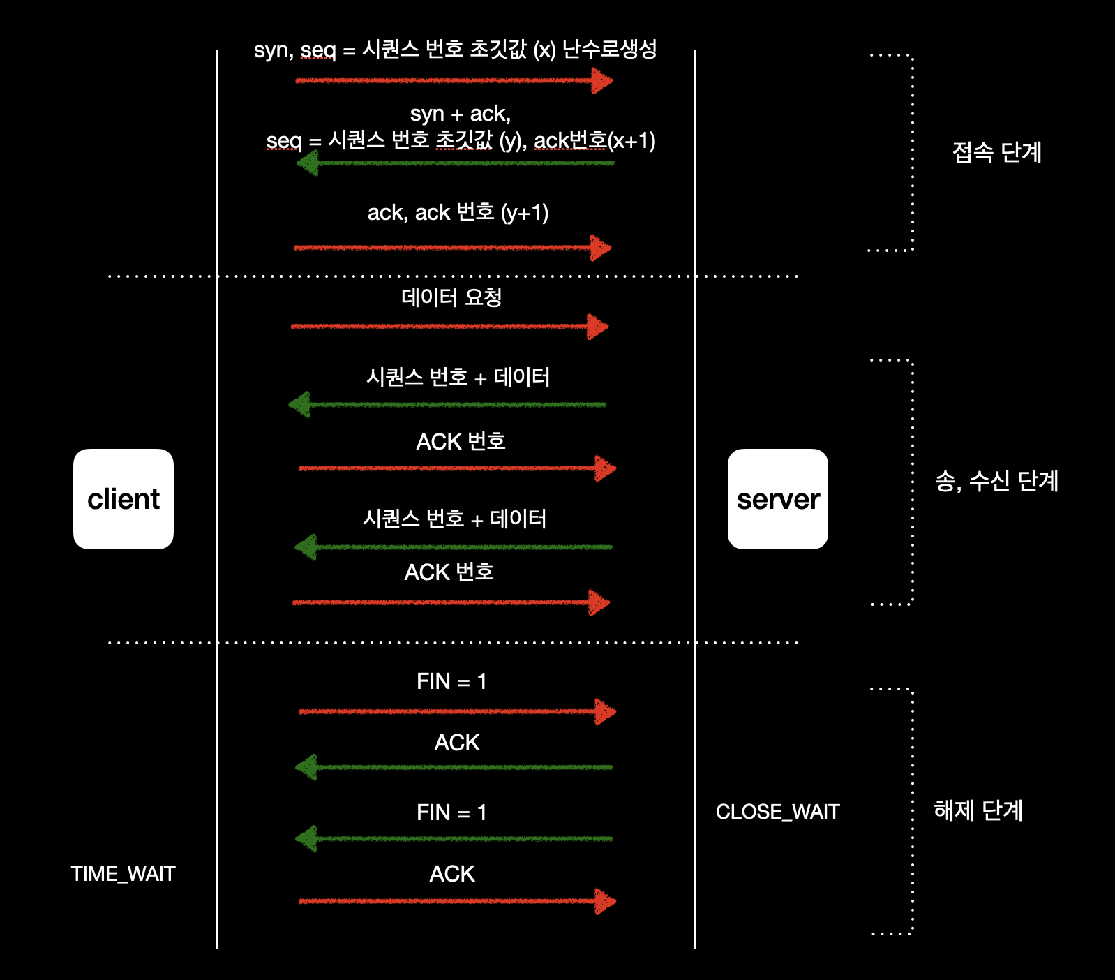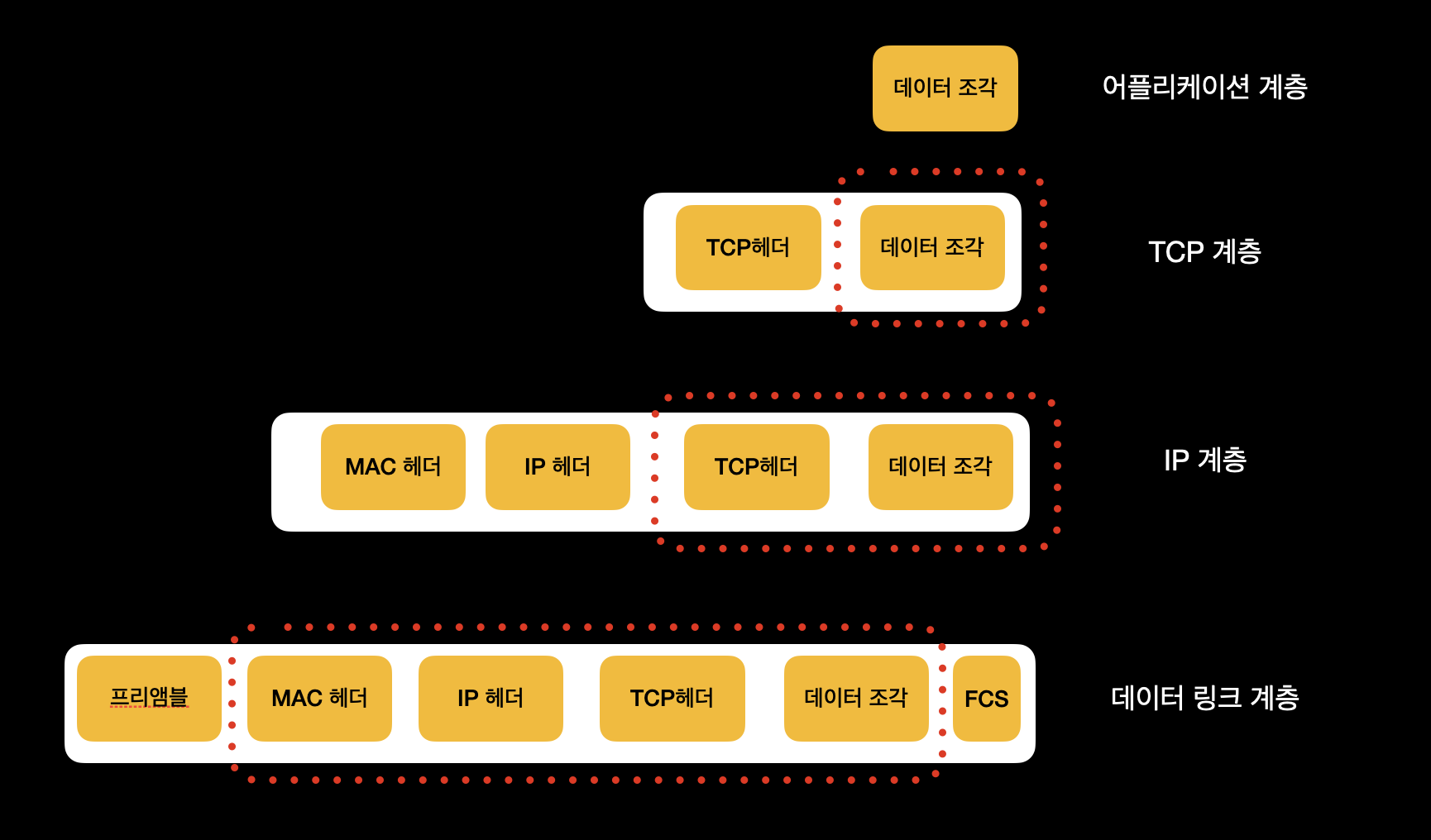 - TCP층에서는 상대방의 포트, 나의 포트가 추가되고, TCP 연결을 위한 flag등이 헤더에 추가되고