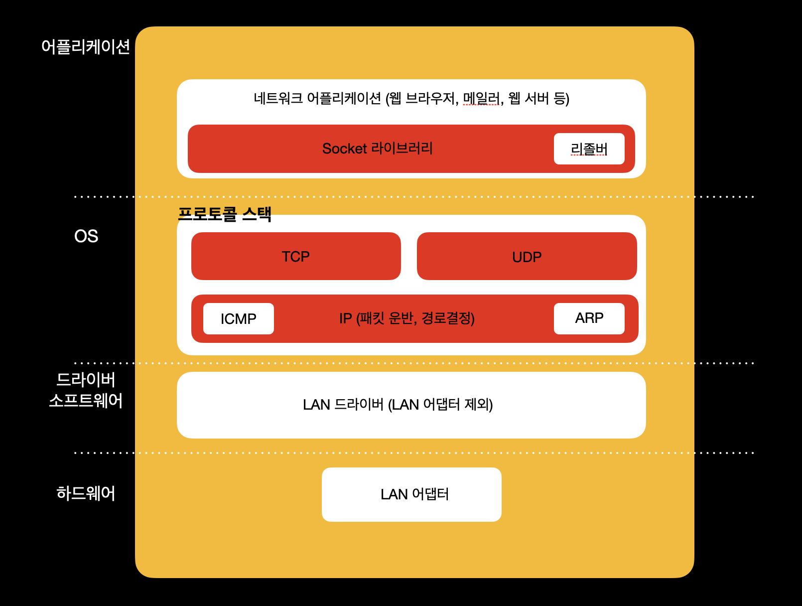 어플리케이션에서 네트워크 요청은 OS의 내부에 포함된 프로토콜 스택에 실행을 의뢰합니다.