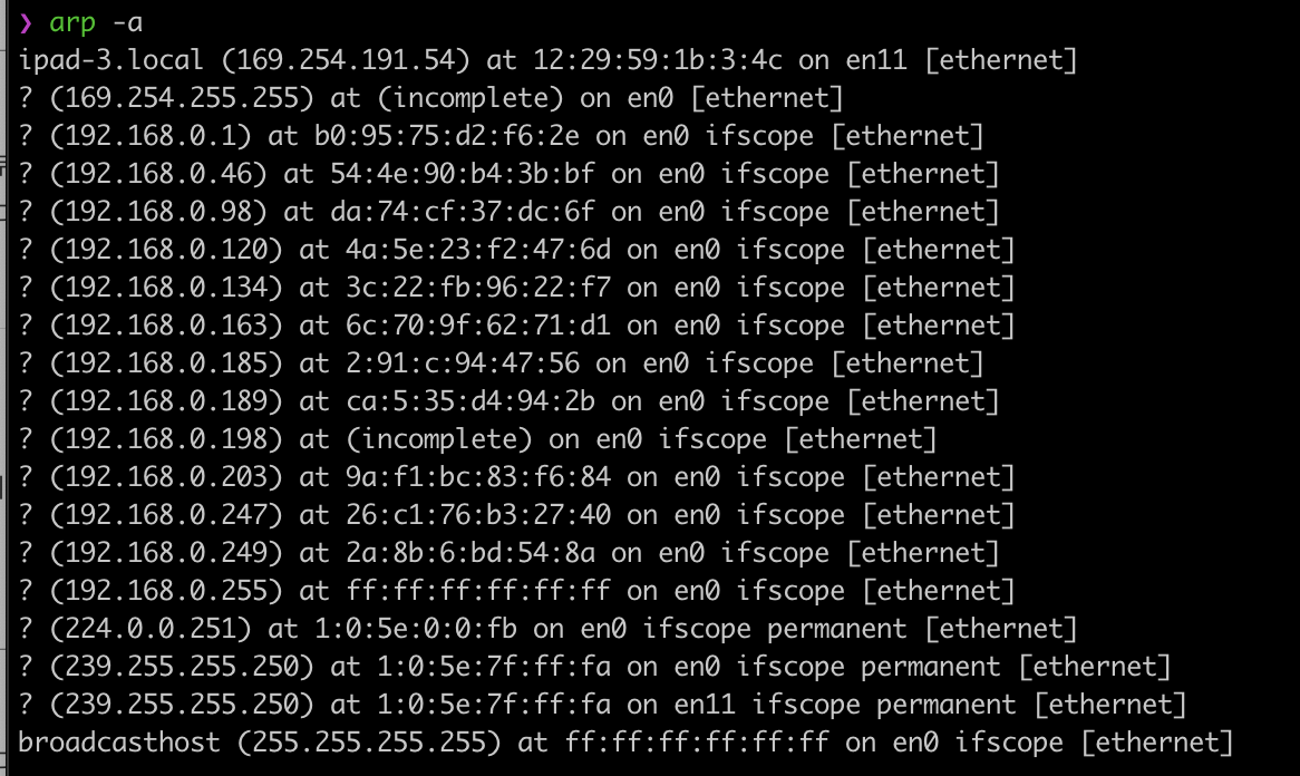 command line에서 arp -a 명령어를 통해 arp 캐시의 내용을 확인할 수 있습니다.