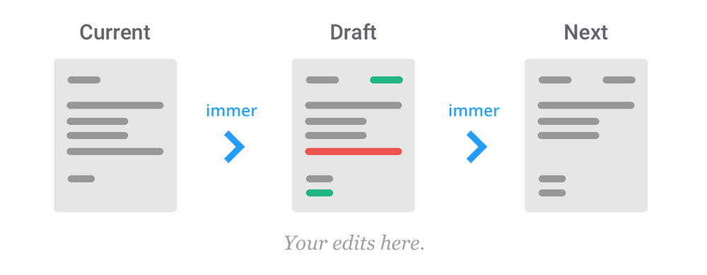 Immer와 같은 솔루션은 mutable 코드를 작성하고 immutable하게 실행되도록 해줍니다. 기본 idea는 현재 상태의 대리자인 draft 상태를 변화 시키는 것입니다. mutation이 완료되었다면 immer는 draft state의 변화에 근거하여 다음 state를 생성할 것입니다.