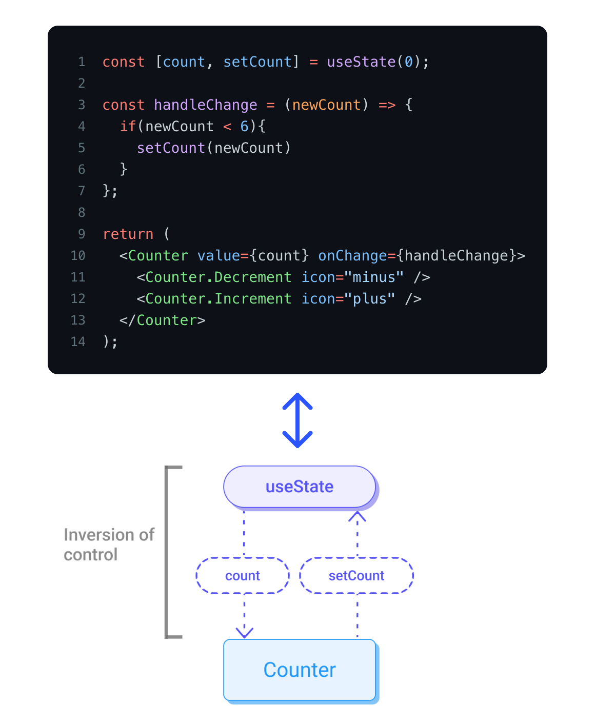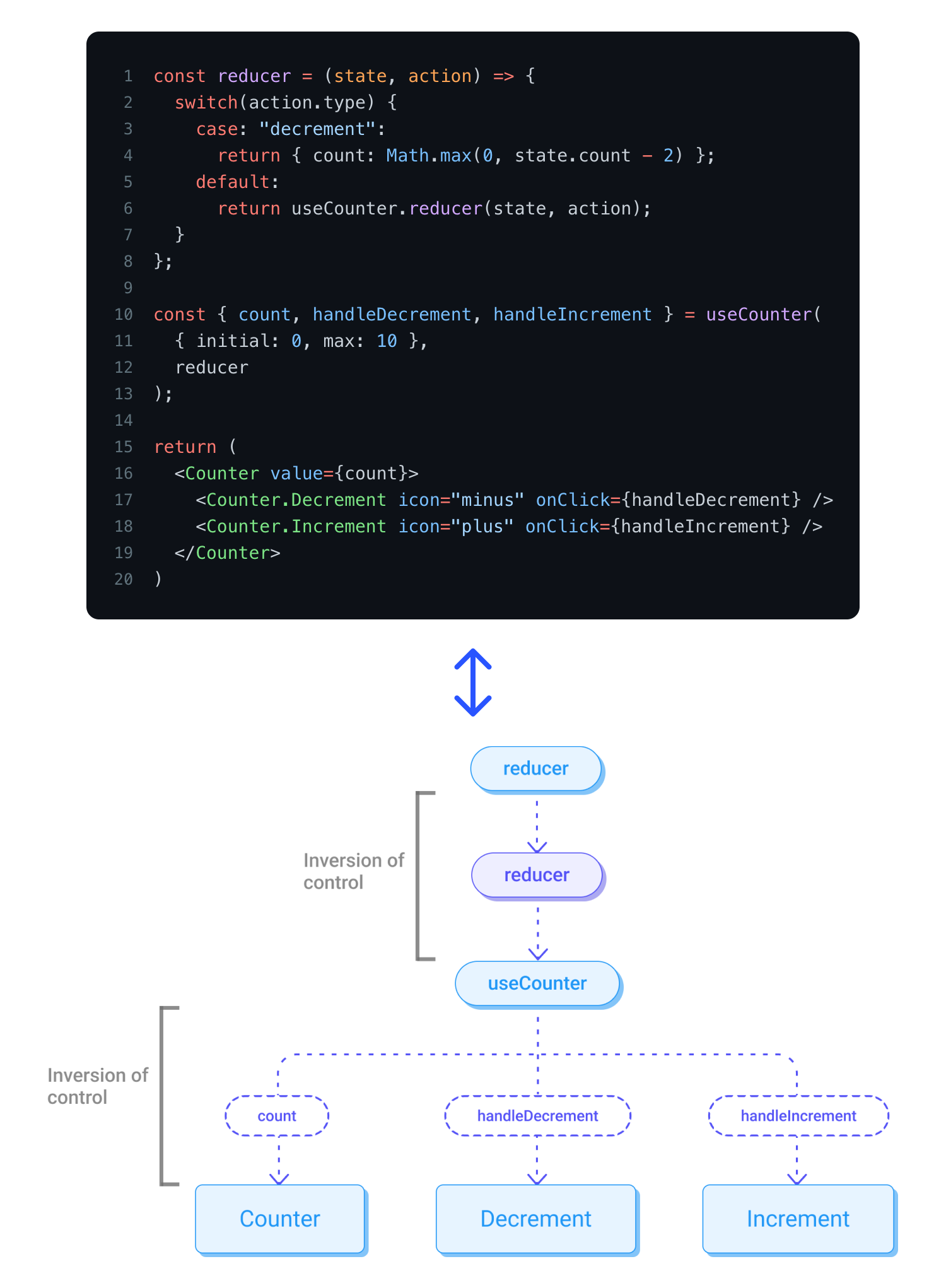 * 더 많은 제어권: 개발자는 Counter 동작을 수정하면서, useCounter와 Counter 사이에 커스텀 로직을 더 부여할 수 있습니다.