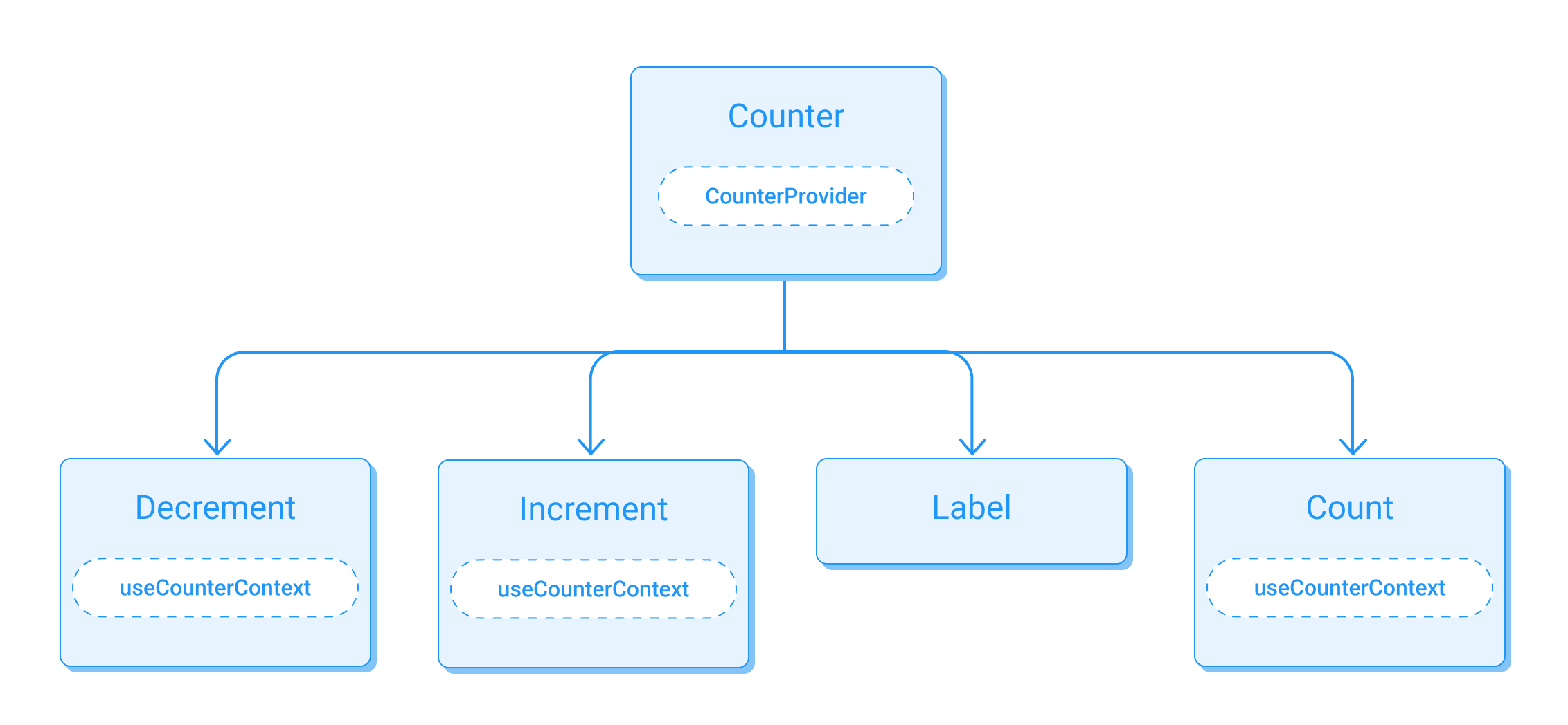 * 관심사의 분리: 대부분의 로직은 Counter에 집중됩니다. 하나의 context(CounterProvider + useCounterContext)가 Counters' 자식들에게 상태(counter)와 handler(handleIncrement(), handleDecrement())를 다루기 위해 사용됩니다.