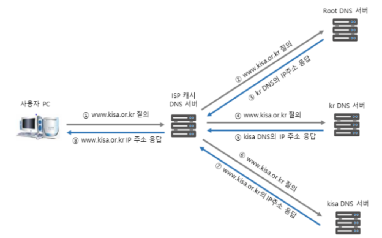 * ISP(Internet Service Provider) 캐시 DNS 서버에 KISA 도메인의 IP 주소가 있을 경우, 사용자 PC로 바로 응답(1,8)
