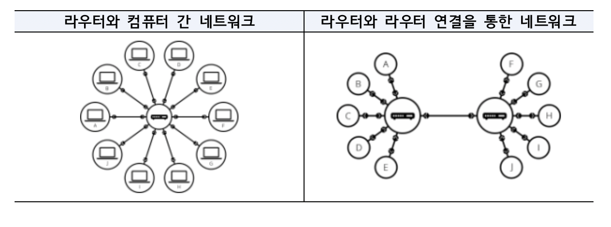 * 단일 라우터로 더 많은 연결에 한계가 존재하여 라우터와 라우터 연결을 통한 네트워크 확장 가능