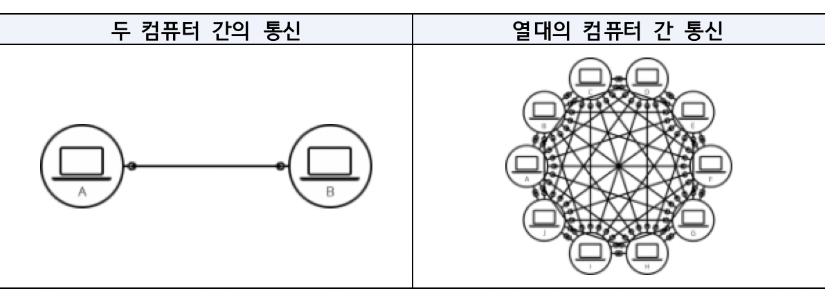 * 컴퓨터간 통신이 필요할 때 물리적(케이블 선) 또는 무선(wifi, bluetooth)으로 연결 가능, 여러 컴퓨터를 연결해야할 시는 비효율이 바랭할수 있다.